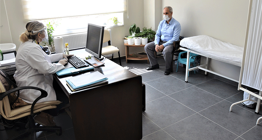 Aile Sağlığı Merkezleri’ne girişte triaj sistemi uygulandığının bilgisini veren Uzm. Dr. Kaşıkcı, “Merkezlere gelen hastalar ilk olarak girişte en az birer metre aralıklarla bekletiliyor ve içeriye sırayla alınıyorlar. Aile Sağlığı Merkezleri’ne girişlerde dezenfektanlara kolayca ulaşabilen hastalarımıza, başvuru esnasında ateş ölçümü de yapılarak öksürük, nefes vb. semptomları sorgulanıyor. Ateşi olan ya da enfeksiyon şüphesi taşıyan hastalar, buradan diğerleriyle temas ettirilmeden Covid-19 olası vakaları için ayrılmış bir muayene odasına alınıyor. Kişi hastaneye sevk edilene kadar burada izole bir şekilde tutuluyor.” diye konuştu.