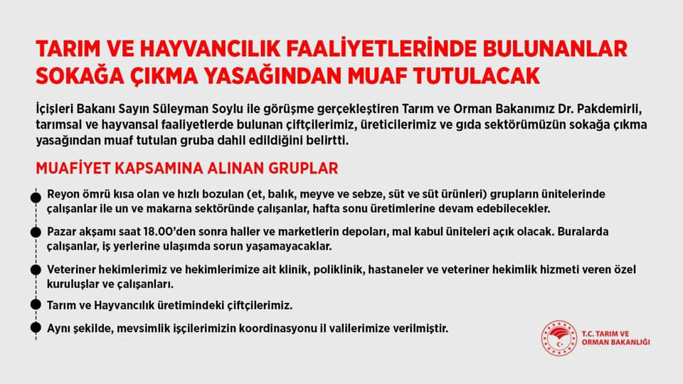 Hafta sonu uygulanacak sokağa çıkma yasağının, genelge ile istisnai kapsamında olacak bir grup da Tarım ve Hayvancılık üretimindeki çiftçilerimiz. Bu vatandaşlarımız da üretimlerini aksatmadan devam edebileceklerdir.