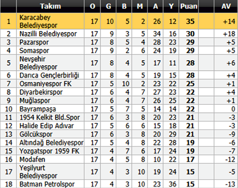 Diyarbekirspor deplasmanından çok değerli bir galibiyet alan Karacabey Belediyespor, bu sonuçla puanını 35’e yükselterek, sezonun ilk devresini de lider kapatmayı garantiledi. Ayrıca temsilcimiz, en yakın rakibi Nazilli Belediyespor’un kendi sahasında Gölcükspor’a 3-1 mağlup olmasıyla puan farkını da 5’e çıkartarak, zirveye iyice yerleşti.