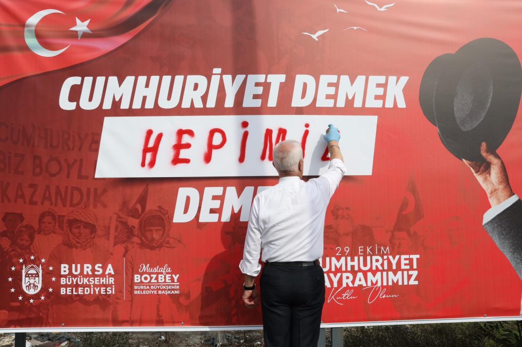 Kampanyaya ‘Cumhuriyet demek, hepimiz demek’ diyerek katılan Bursa Büyükşehir Belediye Başkanı Mustafa Bozbey de sloganını billboarda sprey boyayla yazdı. 29 Ekim’de Cumhuriyet Bayramı coşkusunu yaşamak için tüm Bursalıları alanlara davet eden Başkan Mustafa Bozbey, “Cumhuriyet demek, hepimiz demek. Cumhuriyet demek, aydınlanma demek. Cumhuriyet demek, bağımsızlık demek. Cumhuriyet demek, vatan demek. Cumhuriyet demek, Atatürk demek. Onun için Cumhuriyete sahip çıkmak hepimizin sorumluluğudur. Hep birlikte en büyük bayramımızı kutlayalım. Cumhuriyeti gelecek kuşaklara hep birlikte taşıyalım” dedi.