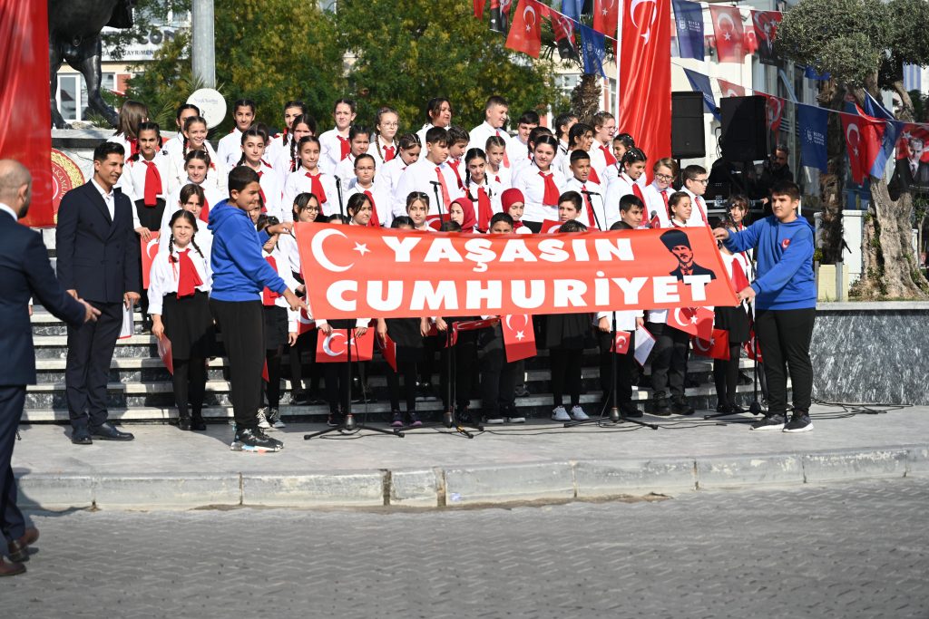 Cumhuriyet’in kuruluşunun 101. yıldönümü Cumhuriyet Meydanı’nda sabah saat 09.30’da düzenlenen resmi törenle başladı. Karacabey Kaymakamı Hakan Kafkas ve ilçe protokolü, siyasiler, sivil toplum kuruluşu temsilcileri, eğitim camiası, askeri erkan ve vatandaşların hazır bulunduğu tören, saygı duruşu ve İstiklal Marşı’nın okunmasıyla başladı. Kaymakamlık, Garnizon Komutanlığı ve Belediye Başkanlığı’na ait çelenklerin Atatürk Anıtı’na sunulmasının ardından günün anlam ve önemini anlatan şiirler seslendirilirken, İstiklal Ortaokulu öğretmen ve öğrencilerinin hazırlamış olduğu koro ilçe halkına duygu dolu anlar yaşattı. Atatürk ve İstiklal Ortaokulu öğrencilerinin jimnastik gösterisi de izleyenleri büyüledi. Öte yandan Cumhuriyet’in Yeni Yüzyılı konulu okullar arası yarışmalarda dereceye giren öğrencilere ise ödüllerini protokol üyeleri takdim etti.