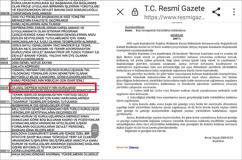 AFAD’ın kuruluş aşamasında AKUT hedefe konmuş, yöneticileri tehdit edilmiş, binaları elinden alınmıştır. Önceki yazımızda EMASYA’nın AK Parti tarafından kaldırıldığını yazmış, tarih ve ek bilgilere de yer vermiştik. UDK (Ulusal Deprem Konseyi) de AK Parti tarafından kaldırılmıştır. Bazı genelgelerin yürürlükten kaldırılması 2007/1 Sayılı genelge ile yürürlüğü durdurulmuştur. İlgili genelge ve eki aşağıdadır.