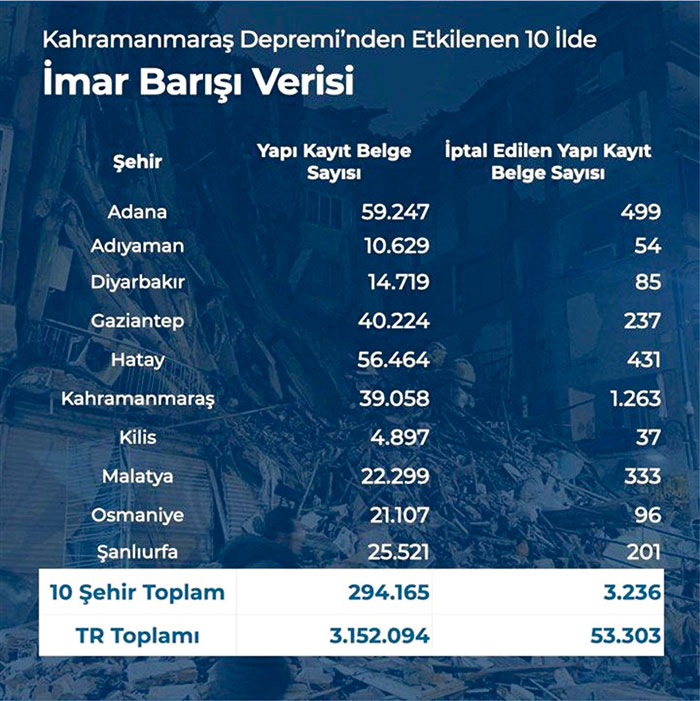 AK Parti hükümetleri tam 8 kez İmar Barışı çıkardı. Dokuzuncunun hazırlığını ise depremzedeler için ağlayan BBP Genel Başkanı Mustafa Destici hazırlanmaktadır! Sonrasında imzaya açılacak. Yeterli imza sayısına ulaşınca Meclis gündemine alınacaktır. Depremin mahvettiği illerimizde uygulanan İmar Barışı ile affa uğrayan konut sayıları aşağıdadır. Kaynağı AFAD’tır.