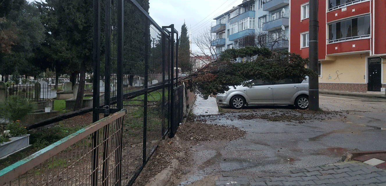 Karacabey’de önceki gün etkisini gösteren yağışlı hava ve şiddetli rüzgar ilçede ağaçların devrilmesine neden oldu. Meteoroloji Genel Müdürlüğünün yaptığı uyarıların ardından yağışlı hava ve şiddetli rüzgarın etkisini gösterdiği fırtına Karacabey’de zor anların yaşanmasına sebep oldu. Bazı noktalarda evlerin çatıları uçarken, bazı noktalarda ise rüzgar ağaçları devirdi. Çatı uçması ve ağaçların devrilmesi nedeniyle zor anlar yaşanırken, şans eseri yaralanan olmadı. Bazı noktalardaki ağaç devrilmeleri nedeniyle araçlar hasar görmekten son anda kurtuldu. İHA