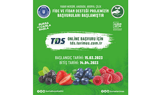 Bursa’da katma değeri yüksek yaban mersini, ahududu, aronya ve çilek üretiminin artırılmasını hedefleyen Büyükşehir Belediyesi’nin yüzde 60 hibeli fide ve fidan desteğinden yararlanmak için başvurular başladı. Tarım Peyzaj A.Ş. tarafından dağıtılacak fide ve fidanlar için başvurular tds.tarimas.com.tr adresi üzerinden online yapılacak.