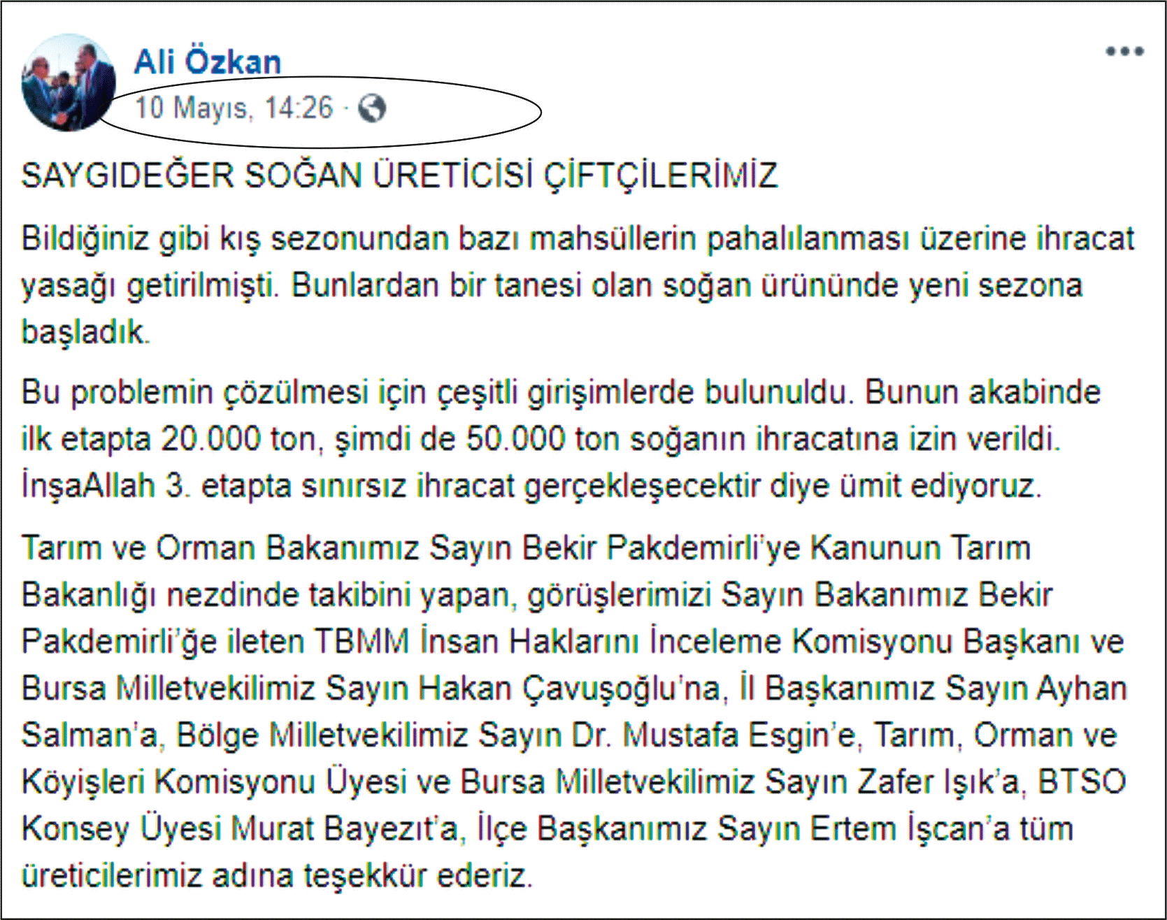 Özkan bu paylaşımında; “SAYGIDEĞER SOĞAN ÜRETİCİSİ ÇİFTÇİLERİMİZ, Bildiğiniz gibi kış sezonundan bazı mahsullerin pahalanması üzerine ihracat yasağı getirilmişti. Bunlardan bir tanesi olan soğan ürününde yeni sezona başladık. Bu problemin çözülmesi için çeşitli girişimlerde bulunuldu. Bunun akabinde ilk etapta 20.000 ton, şimdi de 50.000 ton soğanın ihracatına izin verildi. İnşallah 3. etapta sınırsız ihracat gerçekleşecektir diye ümit ediyoruz. Tarım ve Orman Bakanımız Sayın Bekir Pakdemirli’ye, kanunun Tarım Bakanlığı nezdinde takibini yapan, görüşlerimizi Sayın Bakanımız Bekir Pakdemirli’ye ileten TBMM İnsan Haklarını İnceleme Komisyonu Başkanı ve Bursa Milletvekilimiz Sayın Hakan Çavuşoğlu’na, İl Başkanımız Sayın Ayhan Salman’a, Bölge Milletvekilimiz Sayın Dr. Mustafa Esgin’e, Tarım, Orman ve Köyişleri Komisyonu Üyesi ve Bursa Milletvekilimiz Sayın Zafer Işık’a, BTSO Konsey Üyesi Murat Bayezıt’a, İlçe Başkanımız Sayın Ertem İşcan’a tüm üreticilerimiz adına teşekkür ederiz.” ifadesini kullanmıştı.