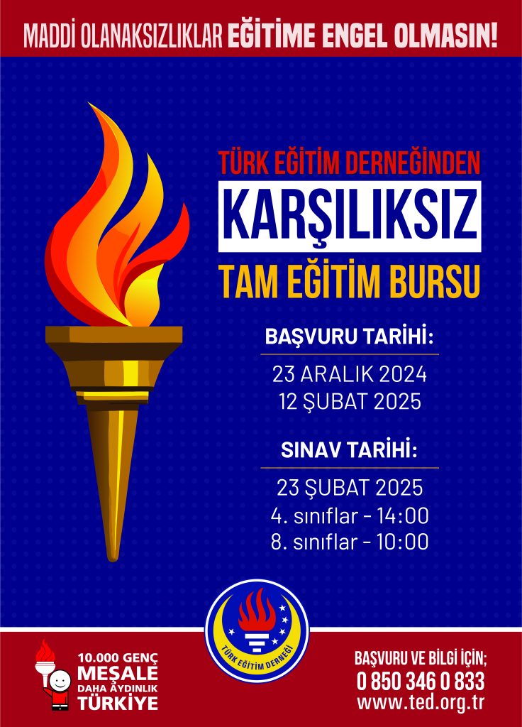 Son başvuru tarihi 12 Şubat 2025 olan sınav için başvurular, www.ted.org.tr adresinden online olarak yapılmakta. Sınavda başarı gösteren öğrenciler, mülakat süreciyle hayallerine bir adım daha yaklaşacak.